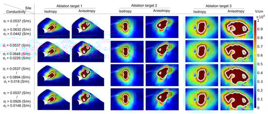 To determine the surface ablation area, this study first created the surface and isoline in the result of the electric field intensity distribution in COMSOL and set the value of isoline to 1000 V/cm, then selected the different plane views for each ablation target (ablation target 1: X-Z plane, 2: X-Y plane, 3: X-Z plane). Finally, this study enlarged and adjusted the view of the electric field intensity distribution at each ablation target under the condition of different groups of electrical conductivity, and the magnification of the view is the same in all cases. Figure 7 shows that under the condition of the PFA, the amplitude is 1000 V, and the electric field intensity distribution with ablation isoline (1000 V/cm) is generated by different ACs and ICs at three ablation targets.