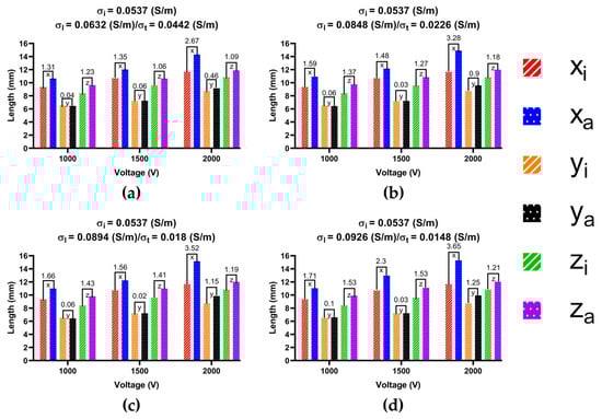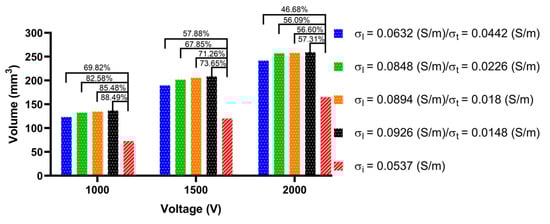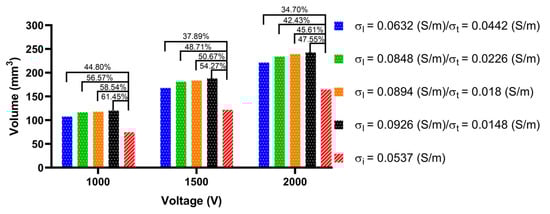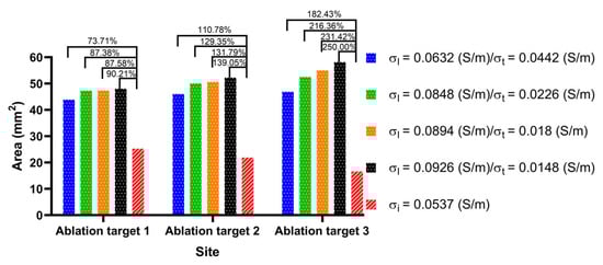 The electrical conductivity groups in Figure 7 are arranged in ascending order of anisotropy ratio from top to bottom. As shown in Figure 7, at the same ablation target, the differences in the surface ablation area generated by AC compared with IC are distinguishable. Under the condition of a different AC, with the increase in the anisotropy ratio, the surface ablation area tends to extend towards the fiber orientation at the ablation target. According to Figure 8, under the condition of the same ablation target, the sizes of the surface ablation area generated under the condition of AC are all larger than IC, and with the increase in the anisotropy ratio, the difference in the size of the surface ablation area generated by AC compared with IC increases at each ablation target. The percentage differences in the size of the surface ablation area between AC and IC are significant, since the values are greater than 73.71% in all cases.
