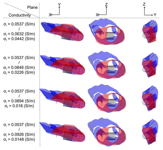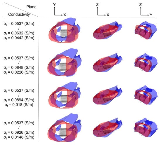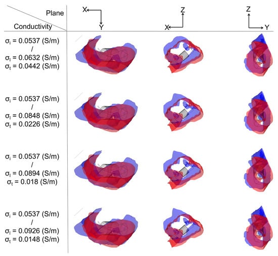 The electrode direction relative to the fiber orientation of tissue has proved to have a significant effect on the ablation effect; in general, when the electrode is parallel to the fiber orientation of tissue, the generated ablation area is larger than that which is perpendicular to the fiber orientation of tissue [,]. The above studies support the reliability of the computational results in this study to a certain extent.
