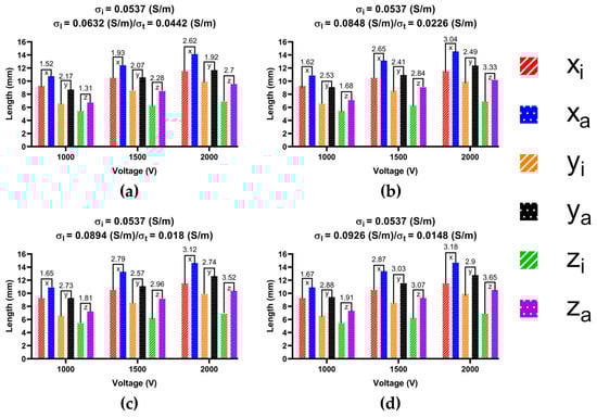 Specifically, as shown in Figure 9, with the increase in the anisotropy ratio, the ablation isosurface extends obliquely towards the top of LSPV along the circumferential fibers. According to Figure 10, except for under the condition of the PFA, the amplitude is 2000 V. The AC and the corresponding IC from the third and fourth electrical conductivity group, as well as the size differences in the Y-axis between AC and IC are all greater than 1 mm; in other conditions, the size differences in the Y-axis between the two are less than 1 mm. The size differences in the X-axis and Z-axis between AC and IC are greater than 1 mm in all cases. Overall, the mean difference in the size of the ablation isosurface in the four electrical conductivity groups is 2.17 ± 0.88 mm (X-axis), 0.35 ± 0.48 mm (Y-axis), and 1.29 ± 0.16 mm (Z-axis), respectively, and the maximum difference is 3.65 mm (X-axis), 1.25 mm (Y-axis), and 1.53 mm (Z-axis), respectively.