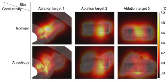 Under the condition of the same PFA parameters (see “Boundary Conditions”) and AC and the corresponding IC from the fourth electrical conductivity group with the highest anisotropy ratio, the final temperature distribution is generated in the myocardium at three ablation targets.
