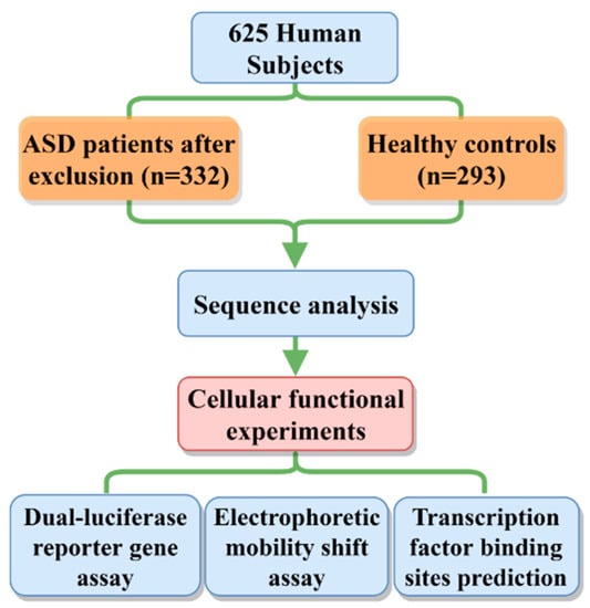 Study flow chart and experimental procedures. A total of 625 subjects participated in the study. Sequence analysis, cell function experiments, electrophoretic mobility shift analysis, and bioinformatics analysis were performed.