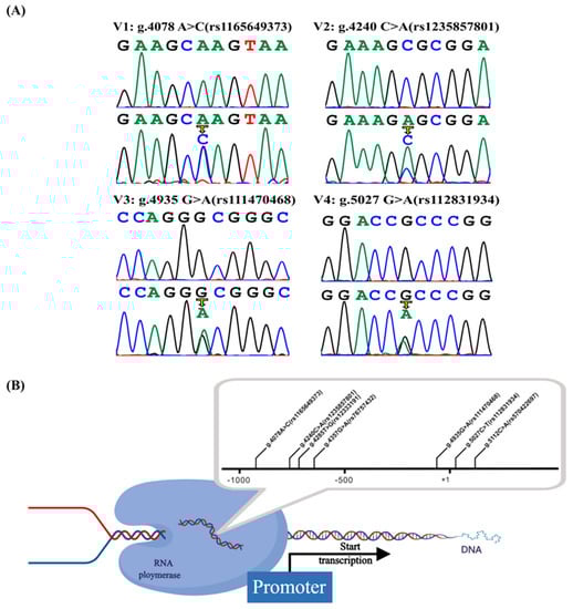 Genomic DNA was extracted from peripheral blood using a blood genomic DNA extraction kit (TIANGEN, China) following standard procedures. The primers were designed based on the reference sequence (NCBI: NG_016169.1) to cover the CITED2 promoter and flanking sequence, from −1197 to +220 to the transcription start point (+1). The 1418 bp segments were amplified by PCR, and the products were sequenced directly by Sanger sequencing as previously reported [18,19,20,21]. The primers required for PCR amplification and Sanger sequencing are shown in Table 1.