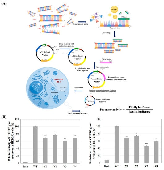 The JASPAR database was used to further study the changes of transcription factor binding sites in the CITED2 promoter region with variants. The relative profile score threshold was set to 85%. JASPAR is an open-access database of annotated, high-quality, matrix-based transcription factor binding site profiles for multicellular eukaryotes [22]. Bioinformatics analysis using the JASPAR database according to Fornes and associates [23] indicated the disruption or creation of potential TF binding sites. The detailed procedures are listed in the JASPAR database (https://jaspar.genereg.net/, accessed on 1 February 2022). By comparison of the predicted results of VT and WT, the disruption (lost TFBs) or creation (new TFBs) of potential TF binding sites can be determined.
