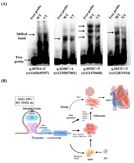 Electrophoretic mobility shift analysis (EMSA) experiments and schema for effect of variants in the CITED2 promoter region on possible pathways in cardiac development. (A) Results of EMSA of CITED2 gene promoter variants. The results show that the variants (g.4078A>C(rs1165649373), g.4240C>A(rs1235857801), g.4935C>T(rs111470468), g.5027C>T(rs112831934)) significantly affected transcription factor binding capacity. Free probes are marked on the bottom; arrows indicate affected binding of unknown transcription factors; WT, wild type; VT, variant. (B) Effect of variants in the CITED2 promoter region on some transcription factors and the possible consequence in cardiac development. CM, mature cardiomyocytes; CPC, Cardiac progenitor cells; hEMP, mesoderm progenitor cells; ESC, embryonic stem cells.