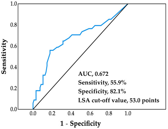 The ROC analysis afforded a cutoff value of LSA for increased risk of cardiovascular hospitalization of 53.0 points (area under the curve, 0.672; sensitivity, 55.9%; specificity, 82.1%; p = 0.003) (Figure 1).