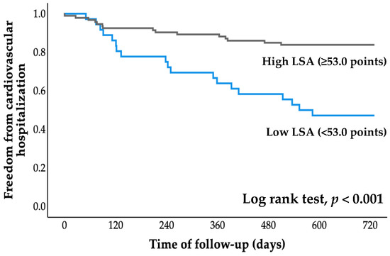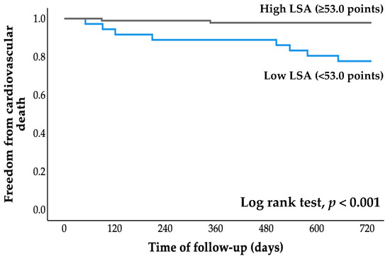 All patients were followed for an average of 2.7 years (range, 0.8 to 4.1 years), starting at the time of entry and ending with a cardiovascular event or the most recent evaluation of survivors. The cumulative probability of event-free survival was calculated using Kaplan–Meier analysis (Figure 2 and Figure 3). The probabilities of cardiovascular hospitalization and cardiovascular mortality in the low LSA group were significantly higher than those in the high LSA group (both p < 0.001, log-rank test).