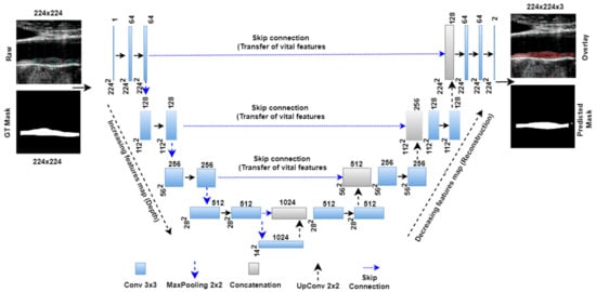 Figure 2 below shows the basic UNet model with four encoder and decoder stages and one bottleneck layer between them. The left part of the architecture forms the encoder arm of the network. Each encoder stage follows the convolutional, ReLU, convolutional, ReLU, and maxpooling layers. The numbers of convolutional filters double in each stage. Thus, the numbers of convolutional filters in successive stages are 64, 128, 256, and 512. The number of trainable parameters (P) after each stage was calculated using the following formula , where m is the height of the convolutional filter, n is the width of the convolutional filter, d is the number of filters in the previous layer, b is the bias, and k is the number of filters in the current layer. The convolutional filter size is 3 × 3, and the default bias value (b) is 1 for each stage. Thus, after each encoder stage the number of the trainable parameters was 38,720, 221,440, 885,248, and 3,539,968, respectively. A bottleneck layer is present after the encoder stage, which carries the most delicate features extracted from the encoder stage. This bottleneck layer holds 14,157,824 numbers of trainable parameters. The right-hand part of the UNet architecture is called the decoder arm. The decoder stage follows the up-convolutional layer, followed by concatenation, convolutional, and ReLU layers.