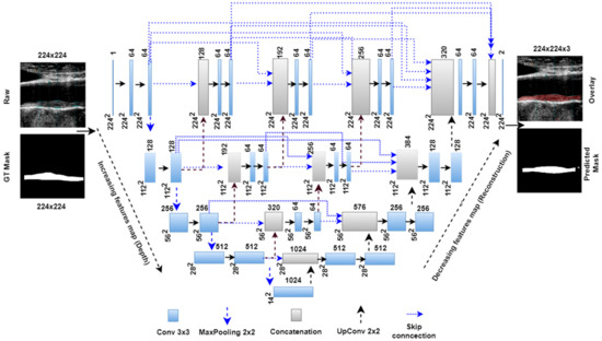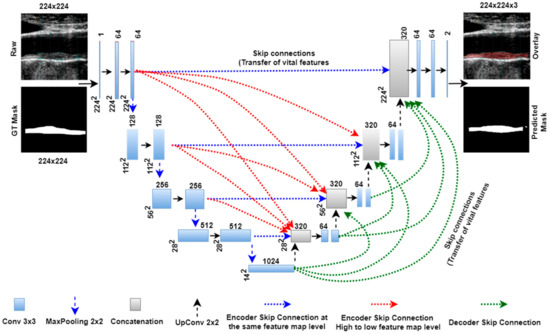 Table 2 comprises the training parameters of different parts of all UNet architectures, such as the encoder arm, decoder arm, bottleneck layer, intermediate stages, fully connected layer (FC), and classification layers. We can also compare the total number of parameters of individual models.