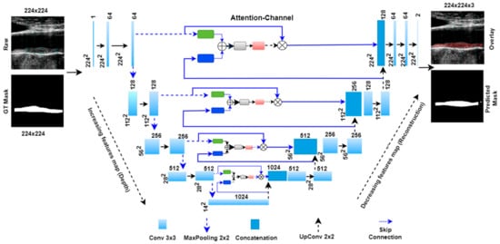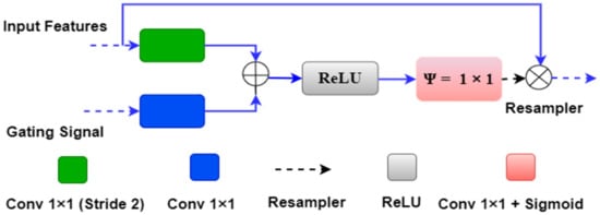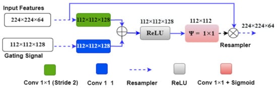 We can understand the above attention mechanism with the example provided in Figure 6, which shows the first attention gate at the skip connection between the first encoder and decoder stages. The input features ‘x’ of size 224 × 224 × 64 originate from the first encoder stage, and the gating signal ‘g’ of size 112 × 112 × 128 comes from one lower decoder level. Input signal ‘x’ is downsampled by green block (convolutional 1 × 1 with #filter = gating signal filter i.e., 128) to the size 112 × 112 × 128. Also, the gating signal passes through the blue box (#filters = 128) with 1 × 1 convolution, so it acquires the same shape as ‘x’, i.e., 112 × 112 × 128. Both signals are added and applied to the ReLU activation function, where any nonlinearity is removed from the combined signal.
