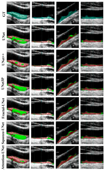 The visual results of UNet, UNet++, UNet3P, Fractal-UNet, Squeeze-UNet, and attention-UNet models are shown in Figure 8. The top row represents binary masks of all databases. The second-row shows overlays of the GT masks over the raw grayscale images in green colour. The third row shows the overlay of the difference between estimated and GT masks on raw grayscale images. Similarly, the fourth, fifth, sixth, seventh, and eighth rows also show the difference between the estimated and GT mask on raw grayscale images for UNet++, UNet3P, Fractal-UNet, Squeeze-UNet, and attention-UNet models, respectively. The red color indicates the estimated mask, and the green color represents the difference of the two masks.