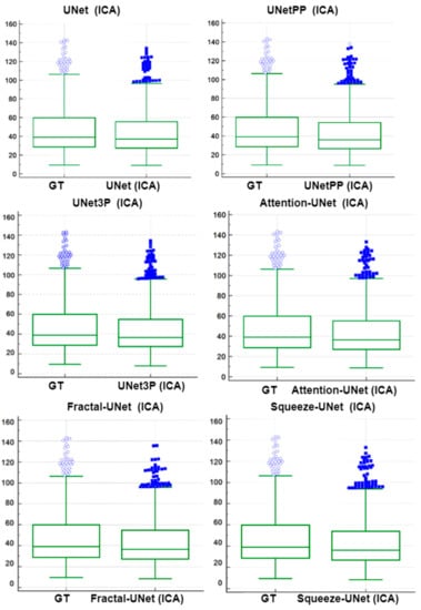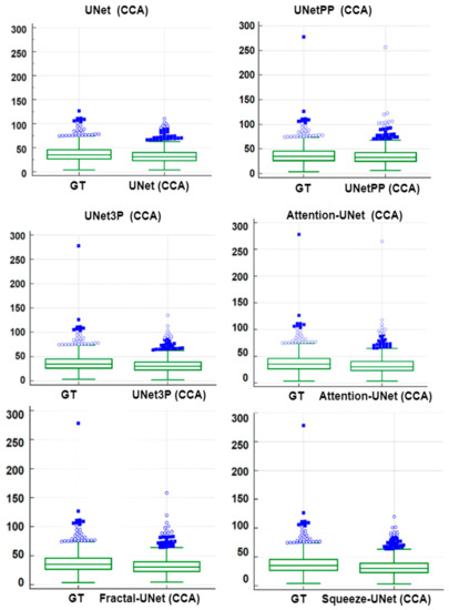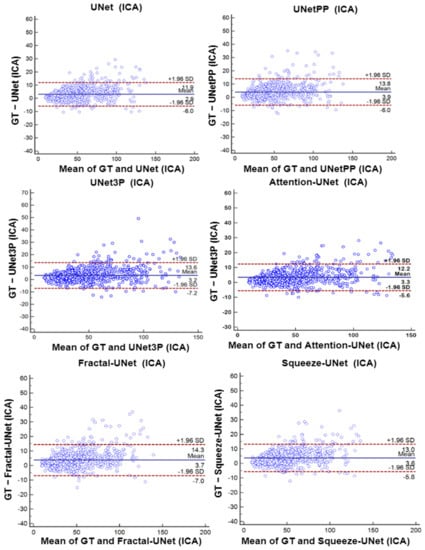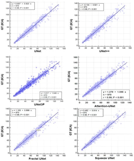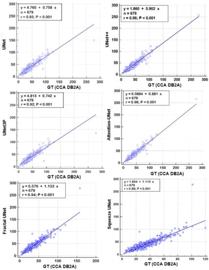 A regression analysis is a powerful statistical tool to analyze the relation between two quantities. It generates a correlation coefficient (CC) between the two variables, which occupies values between 0 and 1. A CC value close to ‘1’ refers to a very high correlation, whereas a CC close to ‘0’ refers to very little correlation between the two quantities. We used ground truth plaque area (GTPA) and predicted plaque area from the model for the regression analysis. Using ICA DB1, we obtained CC values between GTPA and PA from UNet, UNet++, UNet3P, Fractal-UNet, Squeeze-UNet and Attention-UNet of 0.99, 0.98, 0.98, 0.96, 0.96 and 0.99. Similarly, using CCA DB2A, the CC values for the same models are 0.93, 0.96, 0.92, 0.94, 0.89 and 0.96. All values are summarized in Table 5. The regression analysis curve is shown in Figure 10 and Figure 11. From the analysis of all CC numbers, it is clear that the attention-based UNet outperforms the other models.