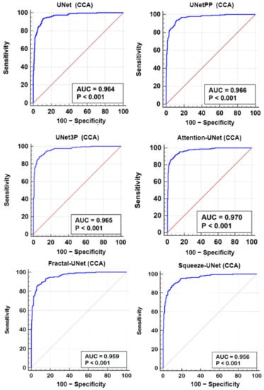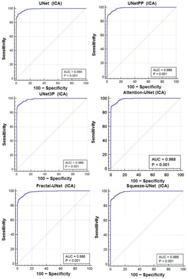 A receiver operating characteristics (ROC) analysis is another performance evaluation tool to assess the classification performance. We cross-examined the literature and found a plaque area threshold value of 40 mm2 used by researchers to classify the low and high risk plaque. Using this threshold value, we generated GT labels ‘1’ and ‘0’ for GTPA > 40 mm2 and GTPA < 40 mm2, respectively. Using the predicted area as the variable and GT labels as the classification variable, we plotted the ROC curve for UNet, UNet++, UNet3P, Fractal-UNet, Squeeze-UNet, and attention-based UNet models for ICA and CCA databases. These ROC curves are shown in Figure 12 and Figure 13 along with the area under the ROC curve (AUC) and p-values. The AUC values are compared in Table 5. Again, it is clear from the AUC numbers and the ROC curves that the attention-based UNet model outperforms other UNet models.