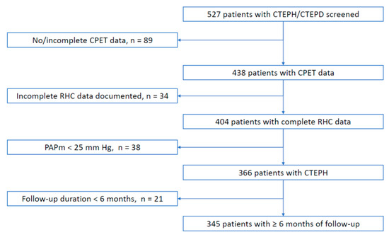 - Zhu, H.; Sun, X.; Cao, Y.; Pudasaini, B.; Yang, W.; Liu, J.; Guo, J. Cardiopulmonary exercise testing and pulmonary function testing for predicting the severity of CTEPH. BMC Pulm. Med. 2021, 21, 324. [Google Scholar] [CrossRef]