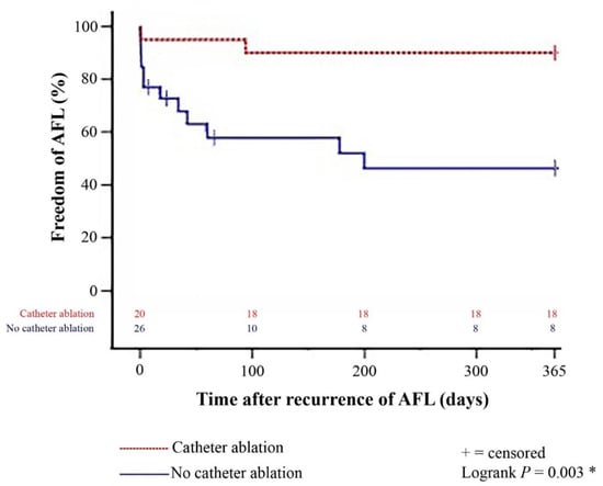 One-year freedom from further episodes of post-transplant AFL stratified by patients with and without catheter ablation after recurrence of late-onset post-transplant AFL (Kaplan–Meier estimator). Patients with catheter ablation after recurrence of late-onset post-transplant AFL had a significantly lower 1-year rate of further episodes of post-transplant AFL than patients without catheter ablation (p = 0.003). AFL = atrial flutter; * = statistically significant (p < 0.050).