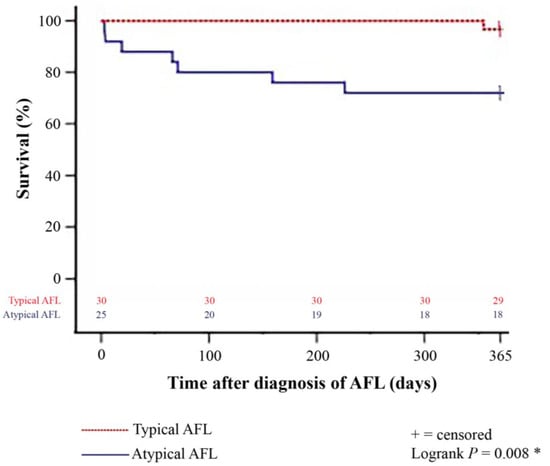 A total of 8 patients (14.5%) deceased within one year after diagnosis of late-onset post-transplant AFL. Patients with atypical AFL showed a significantly higher all-cause 1-year mortality than patients with typical AFL (7 of 25 [28.0%] versus 1 of 30 [3.3%]; p = 0.010). The Kaplan–Meier estimator further showed a statistically significant inferior 1-year survival after diagnosis of late-onset post-transplant AFL in patients with atypical AFL (18 of 25 [72.0%]) in comparison to patients with typical AFL (29 of 30 [96.7%], p = 0.008). The Kaplan–Meier survival curves are displayed in Figure 2.