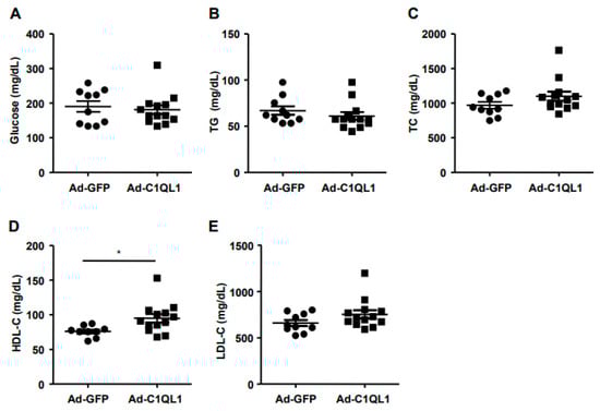 3.2. Overexpression of C1QL1 Elevated HDL-C in ApoE KO Mice
