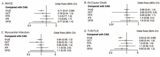 Comparisons of clinical outcomes among guidance modalities included in the network meta-analysis. CAG: coronary angiography; FFR: fractional flow reserve; iFR: instantaneous wave-free ratio; IVUS: intravascular ultrasound; MACE: major adverse cardiovascular events; OCT: optical coherence tomography; OFDI: optical frequency domain imaging; TVR/TLR: target vessel/lesion revascularization. (A) MACE; (B) All-Cause Death; (C) Myocardial Infarction; (D) TVR/TLR.