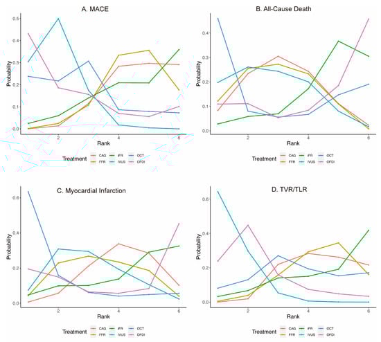 Rank probability analysis for clinical outcomes among guidance modalities included in the network meta-analysis. CAG: coronary angiography; FFR: fractional flow reserve; iFR: instantaneous wave-free ratio; IVUS: intravascular ultrasound; MACE: major adverse cardiovascular events; OCT: optical coherence tomography; OFDI: optical frequency domain imaging; TVR/TLR: target vessel/lesion revascularization. (A) MACE; (B) All-Cause Death; (C) Myocardial Infarction; (D) TVR/TLR.