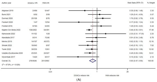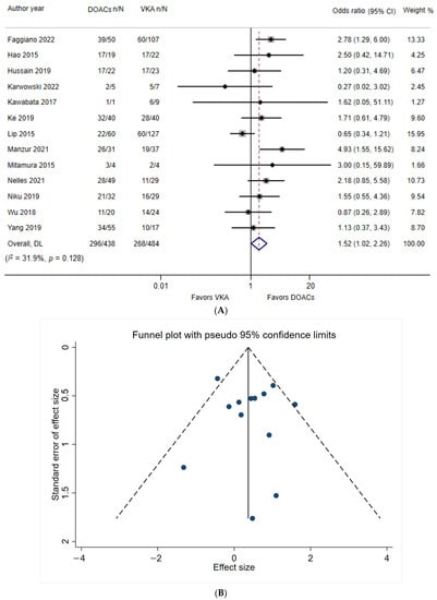 (A) The forest plot of random-effect meta-analysis of the incidence of left arterial appendage thrombus formation under the use of vitamin K antagonist (VKA) and direct oral anticoagulants (DOACs). (B) The funnel plot of the studies included in the meta-analysis of the incidence of left arterial appendage thrombus formation under the use of vitamin K antagonist (VKA) and direct oral anticoagulants (DOACs).