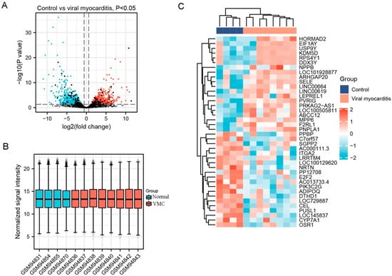 Differentially expressed genes (DEG) analysis on viral myocarditis (VMC). (A) Volcanic plots of gene expression of VMC in GSE4172 using ggplot2 package of R 3.6.3. Red represents upregulated DEGs, blue represents downregulated DEGs, grey represents genes which are not differentially expressed. (B) Cross comparability evaluation of microarray data using ggplot2 package of R 3.6.3. (C) Heat map of the former 50 DEGs using ComplexHeatmap package of R 3.6.3.