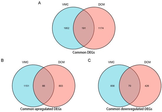 Venn analysis of common differentially expressed genes (DEG) of VMC and DCM using ggplot2 package of R 3.6.3. (A) Venn diagram of common DEGs of VMC and DCM. (B) Venn diagram of common up-regulated DEGs of VMC and DCM. (C) Venn diagram of common down-regulated DEGs of VMC and DCM. (Filter criteria: |log2FC| > 0.58; p-Value < 0.05. For upregulated DEGs, the log2FC >0; For downregulated DEGs, the log2FC <0).