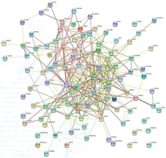 Results of the protein–protein interaction (PPI) network analysis of common differentially expressed genes (DEG) of VMC and DCM constructed using STRING.