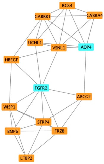 To further explore the roles of these common DEGs, we used protein–protein interaction data from STRING to construct a network which contained 109 nodes and 306 edges (Figure 5). By importing the results of STRING into Cytoscape, we identified 14 hub genes: FGFR2, AQP4, LTBP2, BMP6, WISP1, SFRP4, FRZB, ABCG2, HBEGF, UCHL1, VSNL1, GABRB1, GABRA4, and RGS4 (Figure 6), of which FGFR2 and AQP4 were down-regulated DEGs and others were up-regulated DEGs. The proteins in the network were mainly enriched in regulation of WNT signaling pathway (GO-ID:0030111, p = 0.0413), cellular response to stimulus (GO-ID:0051716, p = 0.0262), and GABA-gated chloride ion channel activity (GO-ID:0022851, p = 0.0467).