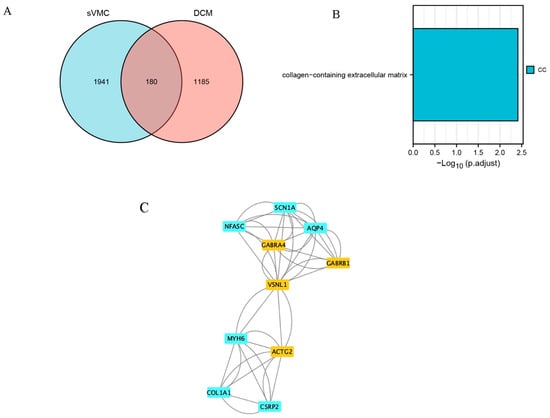 Subgroup analysis for severe myocarditis (sVMC). (A) Venn plot of common differentially expressed genes (DEGs) of sVMC and DCM. (B) Results of GO/KEGG enrichment analysis of the common DEGs of sVMC and DCM. (C) Identification of hub common DEGs of sVMC and DCM by using Cytoscape and MCODE plugin.