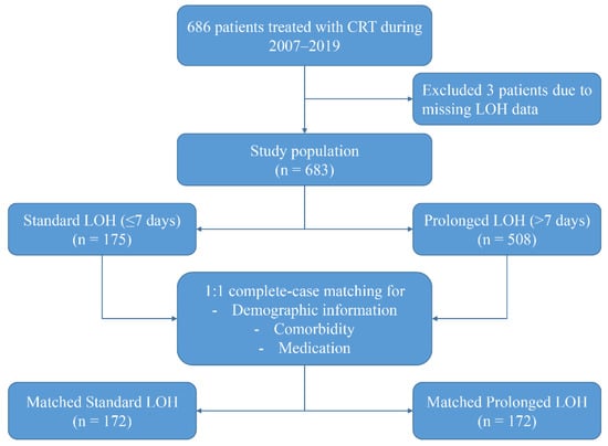 The LOH began on the day of admission, ended at patient discharge during the same hospitalization, and was mainly composed of pre-operative preparation time, surgery time, and post-operative hospitalization time. At our medical center, CRT patients are usually discharged within two days after CRT implantation, and their standard LOH is approximately five days. However, some patients happen to have surgery on a Friday, and since discharge is rarely processed on the weekend, they are usually discharged on the following Monday. Due to the above reasons, this study classified ≤7 days as the standard LOH for CRT patients, and more than 7 days as a prolonged LOH. All baseline information was obtained during CRT implantation.