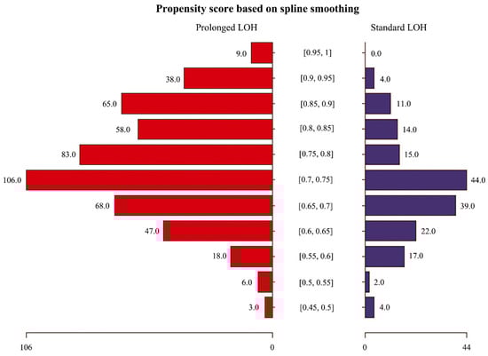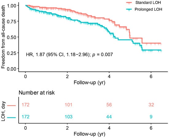 Before propensity score matching, there were differences between the two groups in several baseline variables (Table 1). With propensity score matching, 172 patients with standard LOH (≤7 days) during CRT implantation were matched to 172 patients with prolonged LOH (>7 days). In the propensity score-matched cohort, patients with prolonged LOH had worse cardiac function compared to those with standard LOH (NYHA IV: 6.6% vs. 17.1%; LVEDD: 68.01 ± 9.15 mm vs. 69.98 ± 10.30 mm; NT-proBNP: 1710.70 ± 1733.10 pg/mL vs. 2027.64 ± 2917.72 pg/mL) and higher incidence of VT/VF and AF (VT/VF: 19.2% vs. 30.2%; AF: 14% vs. 23.3%), with a standardized difference significantly higher than 10.0%. More details on comparing baseline characteristics between groups are shown in Table 1.