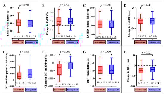 The comparison of follow-up results between the standard LOH and prolonged LOH groups in the propensity score-matched cohort are displayed in Figure 3. Improvements in cardiac function were observed during the follow-up period in CRT patients with standard LOH and those with prolonged LOH. Compared with patients with prolonged LOH, patients with standard LOH had lower NT-proBNP levels (933 ± 1123 pg/mL vs. 1372 ± 1568 pg/mL, p = 0.015, Figure 3E), a more significant reduction in NT-proBNP (−898 ± 1308 pg/mL vs. −383 ± 1153 pg/mL, p = 0.002, Figure 3F), and a more significant reduction in QRS duration (−24.5 ± 25.3 ms vs. −18.3 ± 24.3 ms, p = 0.023, Figure 3H).