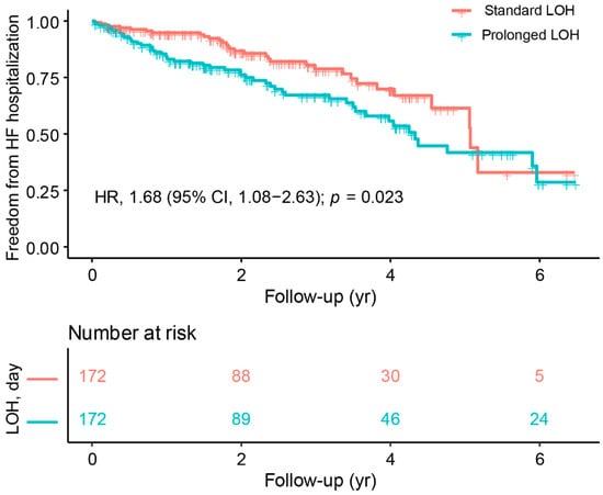 In terms of outcome, patients with prolonged LOH had a higher incidence of all-cause death (18.2% vs. 29.7%, p = 0.019) and a higher incidence of HF hospitalization (19.2% vs. 29.8%, p = 0.032) than those with standard LOH. Figure 4 and Figure 5 display the differences in study outcomes associated with LOH in CRT patients at a mean follow-up of 3.34 years. The KM curve and Cox regression results showed that patients with prolonged LOH had a significantly higher risk of all-cause death than those with standard LOH (HR 1.87, 95% CI 1.18–2.96, p = 0.007) (Figure 4). Similarly, patients with prolonged LOH had a higher risk of HF hospitalization than those with standard LOH (HR 1.68, 95% CI 1.08–2.63, p = 0.023) (Figure 5).
