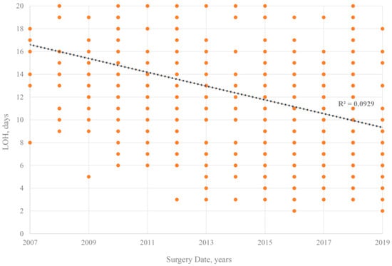 In addition, given that with the improvement of CRT technology, there may be a corresponding decline in LOH. Pearson’s correlation coefficient was used to examine potential associations between the study variables. As shown in Figure 6, the negative connection was not significant (R2 = 0.093).