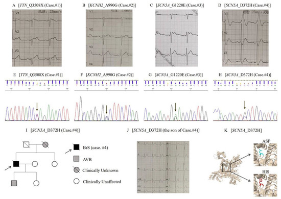 Representative cases of BrS with novel likely pathogenic or pathogenic mutations. (A–D) Each panel shows an electrocardiogram of BrS cases carrying novel mutations. (E–H) All 4 novel mutations of BrS identified in the study were validated by Sanger sequencing. (I) Pedigree of a representative family (Case 4) with SCN5A likely pathogenic mutation. (J) An electrocardiogram of the son of case 4. (K) The schematic structure and details of D372H in SCN5A was predicted with Missense3D. BrS = Brugada syndrome; and AVB = atrioventricular block.
