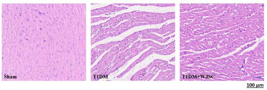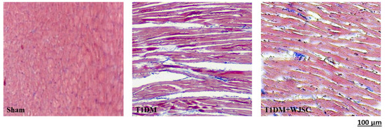 The heart tissue damage results in changes in the cardiac structure. Figure 1 shows the HE stain for experimental heart tissues. Compared to the Sham, the T1DM group exhibited extracellular space, cardiomyocytes disarray and immune cells infiltration. After stem cell therapy (T1DM + WJSC), the aforementioned pathological observations were significantly improved when compared to T1DM. Figure 2 illustrates the blue fiber deposition using Masson’s Trichrome stain. The blue fiber deposition level is proportional to the cardiac fibrosis level. We can see the blue fiber deposition in the T1DM group is more significant than that in the Sham. By contrast, stem cell therapy (T1DM + WJSC) significantly reduced the blue fiber deposition compared to T1DM.