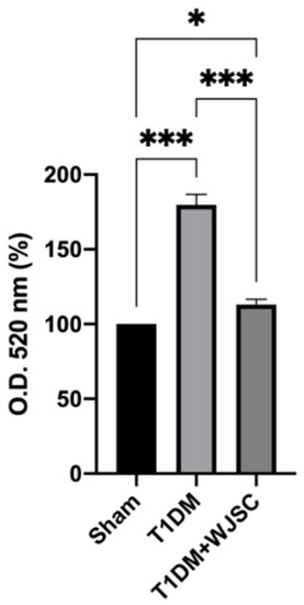 TBARS are stable byproducts after ROS oxidize lipids. Thus, the quantity of TBARS is positively associated with the oxidative stress level. Figure 3 shows the TBARS level for experimental heart tissues. The TBARS levels for the Sham, T1DM and T1DM + WJSC follow the order 100 ± 0, 179 ± 7.2 and 113 ± 3.4, respectively. Significance can be observed between the Sham vs. T1DM (Sham < T1DM, p < 0.001) and T1DM vs. T1DM + WJSC (T1DM > T1DM + WJSC, p < 0.001).