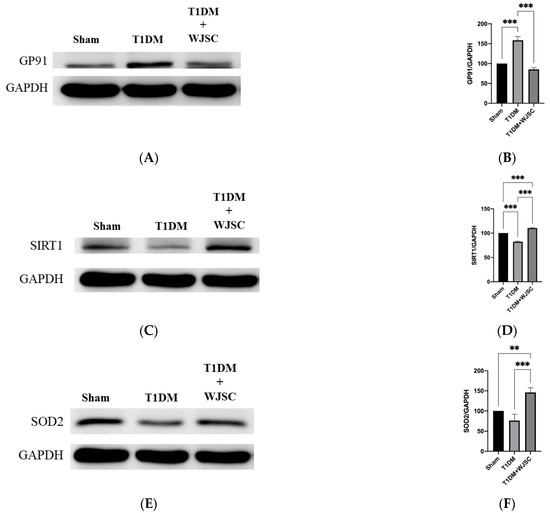 Protein expression was analyzed using western blot. The blotting band intensity is positively associated with the protein expression level. Figure 4A illustrates GP91 protein expression for experimental heart tissues. GP91 expression quantification for the Sham, T1DM and T1DM + WJSC follows the order 100 ± 0, 159 ± 9 and 85 ± 4, respectively (Figure 4B). Significance can be found between the Sham vs. T1DM (Sham < T1DM, p < 0.001) and T1DM vs. T1DM + WJSC (T1DM > T1DM + WJSC, p < 0.001). Figure 4C states antioxidant marker Sirt-1 expression for experimental heart tissues. The Sirt-1 expression quantification for the Sham, T1DM and T1DM + WJSC follows the order 100 ± 0, 82 ± 1.4 and 111 ± 1.0, respectively (Figure 4D). Statistical significance can be observed between the Sham vs. T1DM (Sham > T1DM, p < 0.001), T1DM vs. T1DM + WJSC (T1DM < T1DM + WJSC, p < 0.001) and Sham vs. T1DM + WJSC (Sham < T1DM + WJSC, p < 0.001). Figure 4E points out antioxidant protein marker SOD2 expression for experimental heart tissues. SOD2 expression quantification for the Sham, T1DM and T1DM + WJSC follows the order 100 ± 0, 76 ± 16 and 146 ± 12, respectively (Figure 4F). Significance can be found between the Sham vs. T1DM + WJSC (Sham < T1DM + WJSC, p < 0.01) and T1DM vs. T1DM + WJSC (T1DM < T1DM + WJSC, p < 0.001).