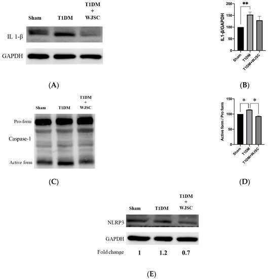 Several main proteins are involved in inflammasome signaling activation, including IL-1β, caspase-1 and NLRP3. Figure 5A illustrates IL-1β expression for experimental heart tissues. The IL-1β expression quantification for the Sham, T1DM and T1DM + WJSC follows the order 100 ± 0, 153 ± 11 and 129 ± 17, respectively (Figure 5B). Statistical significance is shown between the Sham vs. T1DM (Sham < T1DM, p < 0.01). Figure 5C shows caspase-1 expression for experimental heart tissues. The pro-caspase-1 vs. active-caspase-1 ratio for the Sham, T1DM and T1DM + WJSC follows the order 100 ± 0, 118 ± 3 and 94 ± 5, respectively (Figure 5D). Significance can be observed between the Sham vs. T1DM (Sham < T1DM, p < 0.05) and T1DM vs. T1DM + WJSC (T1DM < T1DM + WJSC, p < 0.05). Figure 5E indicates the expression of another inflammasome related protein marker, NLRP3. The fold change for the Sham, T1DM and T1DM+WJSC follows the order 1, 1.2 and 0.7, respectively.