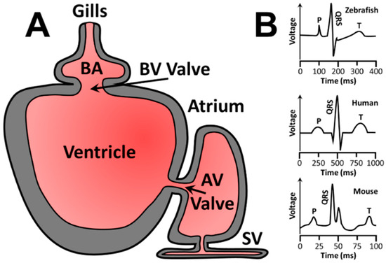 - Tessadori, F.; van Weerd, J.H.; Burkhard, S.B.; Verkerk, A.O.; de Pater, E.; Boukens, B.J.; Vink, A.; Christoffels, V.M.; Bakkers, J. Identification and functional characterization of cardiac pacemaker cells in zebrafish. PLoS ONE 2012, 7, e47644. [Google Scholar] [CrossRef] [PubMed]