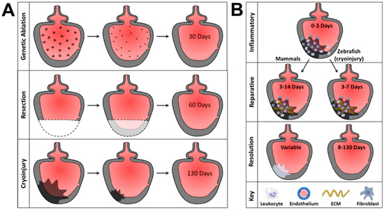 - González-Rosa, J.M.; Martín, V.; Peralta, M.; Torres, M.; Mercader, N. Extensive scar formation and regression during heart regeneration after cryoinjury in zebrafish. Development 2011, 138, 1663–1674. [Google Scholar] [CrossRef]