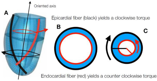 Cartoon showing the torque generation in LV muscular wall. (A) Epicardial fibers (black) have a left-handed helical pattern, while the endocardial ones (red) have a right-handed helical pattern. As a consequence, the hoop component of the contraction generates a torque around the vertical axis of the LV: epicardial fibers yield a clockwise torque, while the endocardial ones yield a counterclockwise torque. (B) Cross section of the LV at diastole, when contraction is null. (C) Cross section of the LV at systole, when contraction is high. If the contractile force is equal in the epicardial and endocardial fibers, the epicardial torque (black) is larger than the endocardial one (red), being different from the lever arm.