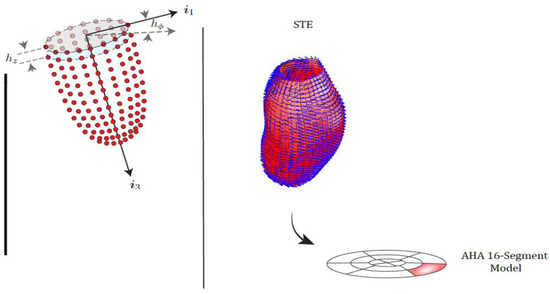 Under 3D-STE procedure the landmarks at the diastole and end of the systole are treated as anatomically homologous and tracked in time; thus, we can use the positions of these landmarks to compute local deformation in terms of strain tensors. The 3D-STE procedure is the application of pattern-matching technology to ultrasound cine data and is based on the tracking of the ‘speckles’ in a 3D volume; speckles are disturbances in ultrasounds caused by reflections in the ultrasound beam: each structure in the body has a unique speckle pattern that moves with tissue. A cubic template image 1 cm3 sized is created using a local myocardial region in the starting frame of the image data. It is worth noting that this does not mean that resolution is at most 1 cm; indeed, 1 cm3 is the dimension of the cubic template (in which the estimation point is centered) followed along different frames in the cardiac cycle, and not the distance between nearby estimation points to be followed in the same frame, which is approximately 0.25 cm. At any successive frame, the algorithm identifies the local speckle pattern that most closely matches the template. Temporal resolution is about 40 ms.