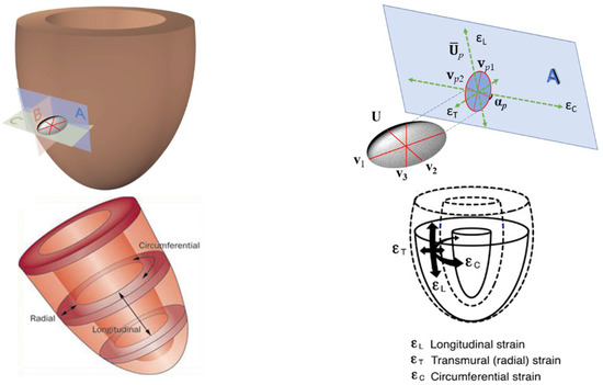 At this point it is useful to recall the relationship between U, p, λ, v, λp and vp with the traditional strains computed in the usual 3D-STE. Classical radial (εT), longitudinal (εL) and circumferential (εC) strains can be thought as elongations/shortenings along anatomically homologous directions that parallelize the notion of homologous landmarks in modern shape analysis. However, while in the case of landmarks, the concept of homology is more easily spatially perceptible, in the case of a direction one is forced to look at it in the context of the whole physical body where this direction is defined. When speaking about the above-mentioned strains, these directions are dictated by platonic pathways (Figure 3 bottom left and right) oriented (i) towards the central axis of the left ventricle orthogonally to local tangent plane A (radial), (ii) along the left ventricle local circumference (circumferential) and (iii) orthogonally to the circumferential direction (longitudinal) on the ventricle’ tangent surface. The radial strain is usually computed considering the myocardial thickness change along the above-mentioned radial direction.
