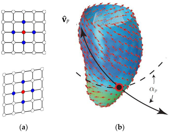 (a) First order neighborhood (in blue) relative to the evaluation point (in red) in a landmark-grid detail (either Endo- or Epi-) showed in the undeformed (diastole) and deformed state (systole). (b) Plane strain tensor p is calculated on the red point using the displacement vectors of the blue ones. The PSD p is then identified upon the eigen decomposition of p. Then, the angle αp is computed with regard to the circumferential direction (dotted line). Modified from [19].