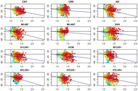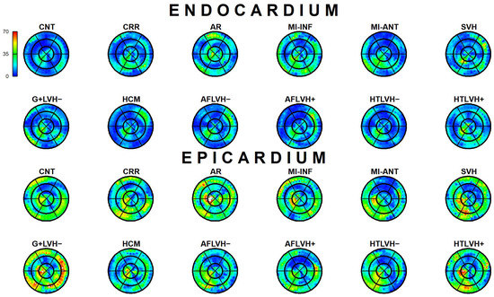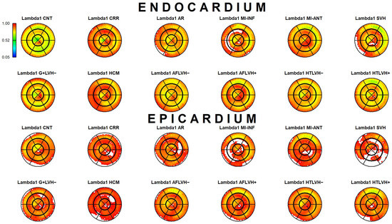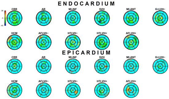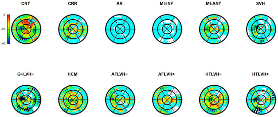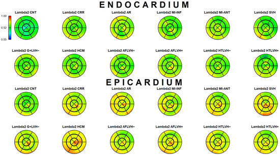 The results of Epi-Endo comparison are illustrated in Figure 5. The bull’s eye plots refer to the per-category and per-landmark median of absolute αp values. The scientific rhetoric carried by this figure is actually at the limit of self-evidence: plane stress PSD in Endo- present an αp constantly smaller and closer to 0 with regard to Epicardium. This signal is constant among all categories analyzed in this study irrespective of disease condition. There is a little variation among pathologies with regard to the control but always under the notion of Endo αp < Epi αp. We then start from this observation to proceed with Epi–Endo statical comparison as well as for CNT versus the other categories. Figure 6 and Figure 7 show the per-landmark and per-category median values of λ1p and λ2p, respectively. As anticipated above, we always found both eigenvalues < 0 with few exceptions for λ1p in some disease conditions. Moreover, as evident from the color code mapped in the bull’s eye plots, we found invariantly |1 − λ2p| > |1 − λ1p|. It is also interesting to note that, albeit the magnitude of strains is not the focus of the present paper, the control differs evidently from the other disease conditions (the control being more deformed), as previously highlighted in several studies regarding 3D-STE strains; the same cannot be said for αp on Figure 5. Figure 8 shows the Endo-Epi αp differences (Δk) subjected to the paired non-parametric test statistics (see Section 2). The key plot is that referred to the control group (CNT), it is not only the most represented cohort in terms of sample size (n = 82), but also because it represents the normal healthy condition. The other categories present very uneven sample sizes, and this inevitably affects the test’s power; for example, AR and MI-INF present only 4 individuals and the p-value should be considered with caution. Regions are colored according to the color bar on top left; Δk < −40 are colored in black; Δk > 0 and with a significant test (very limited) are colored in violet; Δk with a non-significant test are colored in cyan if <0, in white if >0. The first evidence we can observe is the fact that the violet color is nearly totally absent in all plots. This means that Endo-αp are ubiquitously more circumferential than Epi-αp independently from the disease condition. The second evidence is that CNT is nearly entirely occupied by negative values; this means that in the healthy control group Endo-αp are significantly more circumferential than Epi αp. In other categories, this is better observed in those categories represented by relatively larger sample sizes (HCM, HTLVH−). The presence of cyan color (i.e., non-significant test) is associated with those categories with very small sample sizes.