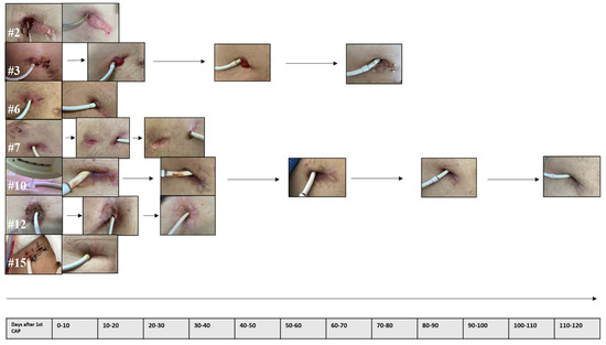 Wound history in seven patients with complete wound healing after CAP treatment alone.