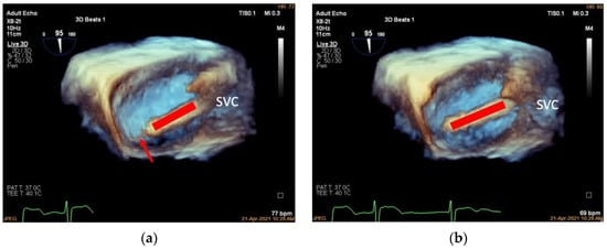 Advancing the guide sheath. (a): Three-dimensional mid-esophageal bicaval view, the guide sheath (red line) slowly advancing along the guidewire (red arrow) to the lower third of the right atrium at about 1 cm from the inferior vena cava; (b): the same view showing the guide sheath after withdrawing the Super Stiff guidewire (red line). SVC, superior vena cava.