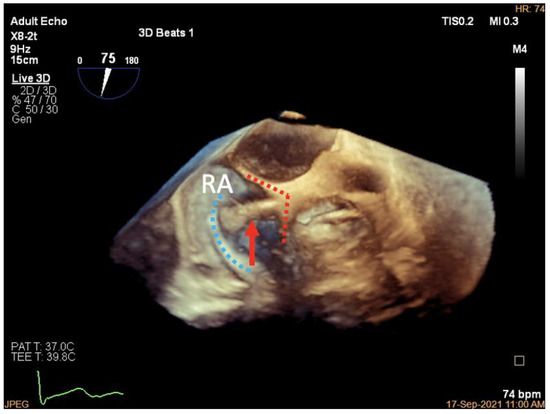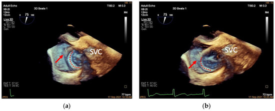 Three-dimensional TEE is also applied to assess the TA and TV morphology including: (1) anteroposterior and left–right diameters of TA and (2) TA circumference and area (Figure 11 and Figure 12). In our initial experience, the TA perimeter and area reduced from 14.13 ± 1.35 mm and 14.93 ± 2.60 mm2 to 12.83 ± 1.47 mm and 12.40 ± 2.61 mm2, respectively, immediately after the procedure (both p < 0.001).