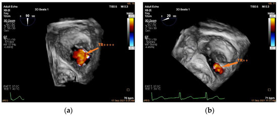- Utsunomiya, H.; Harada, Y.; Susawa, H.; Takahari, K.; Ueda, Y.; Izumi, K.; Itakura, K.; Ikenaga, H.; Hidaka, T.; Fukuda, Y.; et al. Comprehensive Evaluation of Tricuspid Regurgitation Location and Severity Using Vena Contracta Analysis: A Color Doppler Three-Dimensional Transesophageal Echocardiographic Study. J. Am. Soc. Echocardiogr. 2019, 32, 1526–1537.e1522. [Google Scholar] [CrossRef] [PubMed]